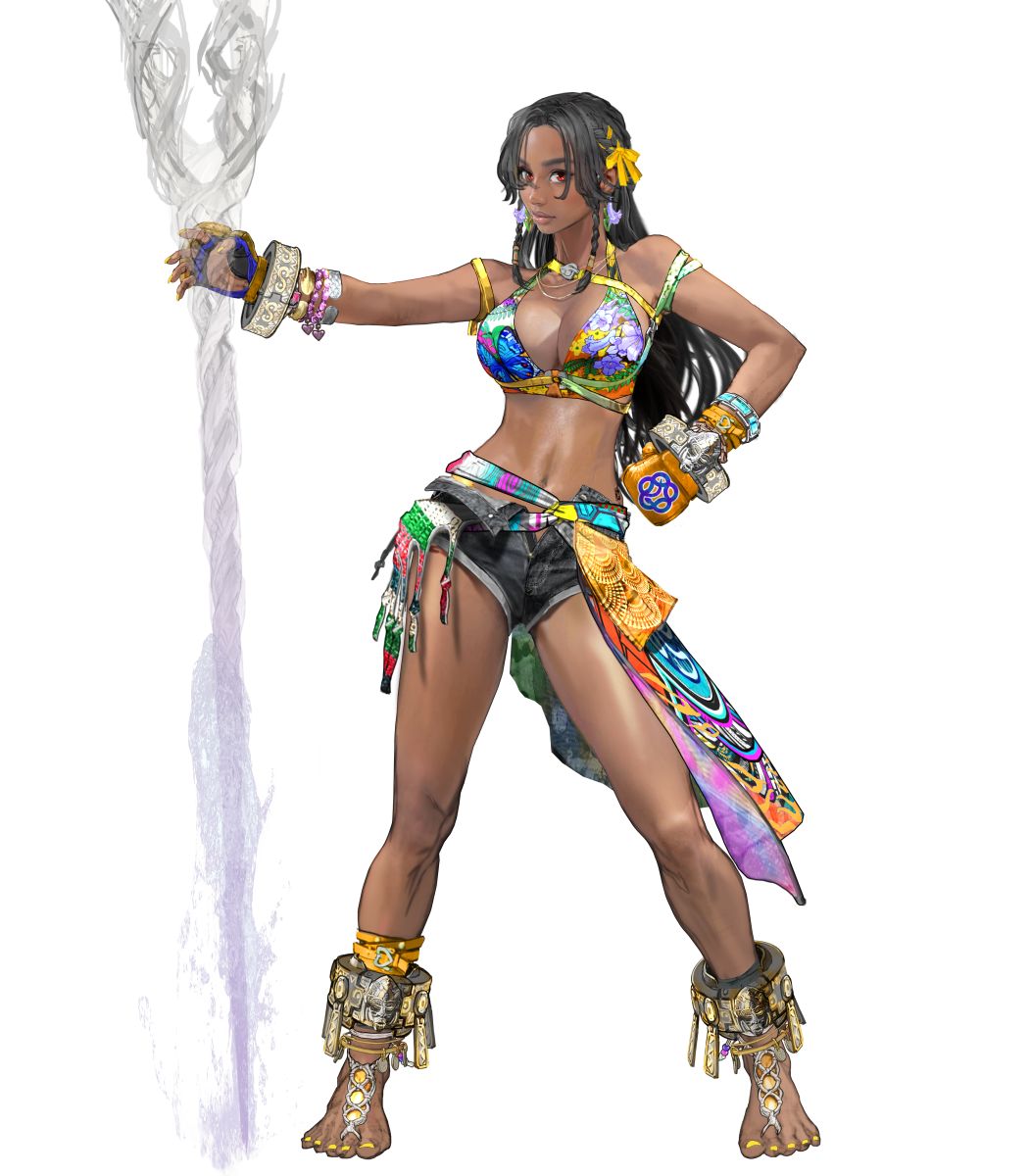 To embody the keyword “Fighting God Reborn,” the large ring-shaped accessories on her arms and legs incorporate elements from Ogre of past titles. Her earrings and top are adorned with jacaranda flowers, an iconic plant of Madagascar, while her spear is designed to resemble entwining baobab trees.