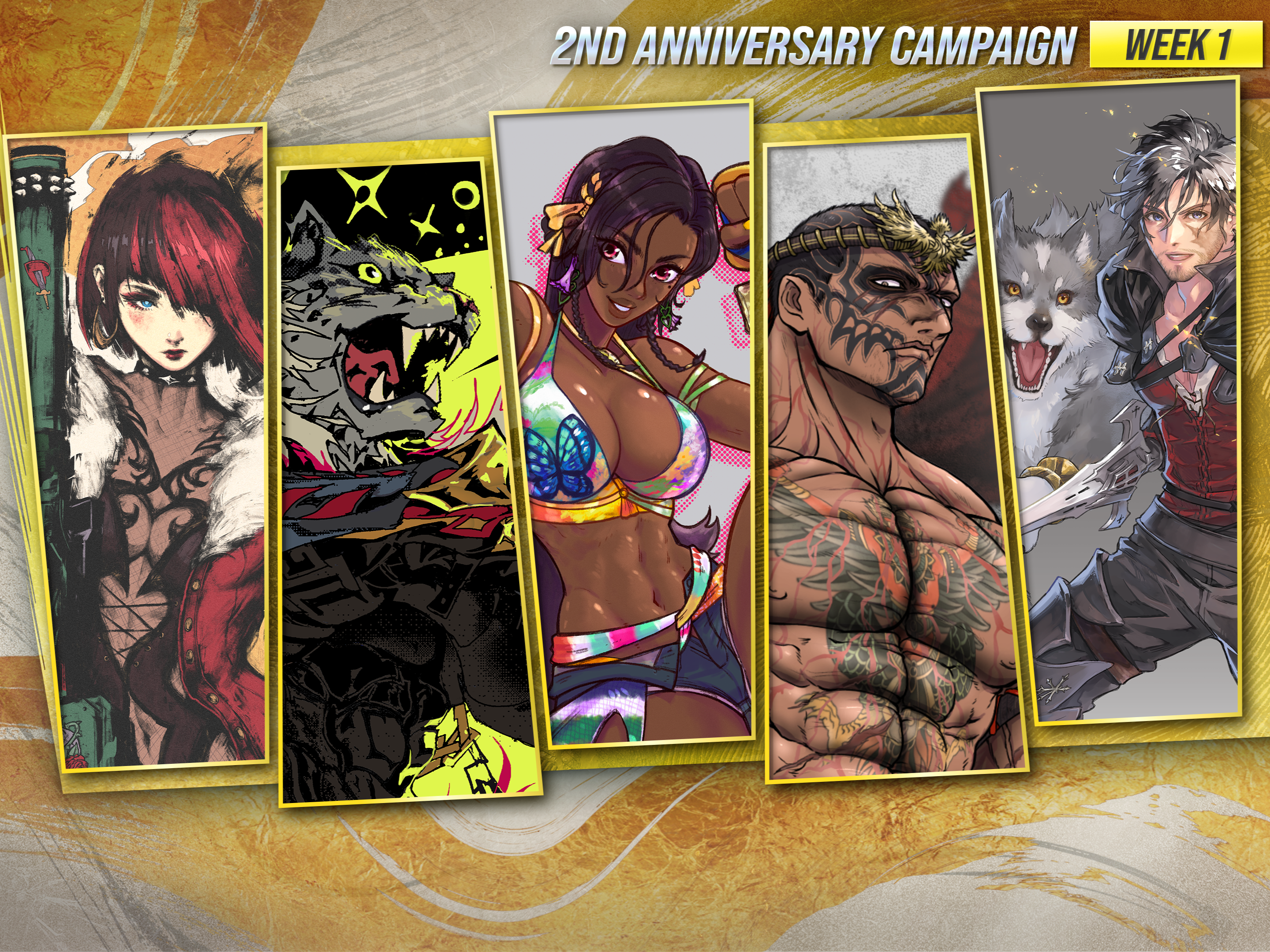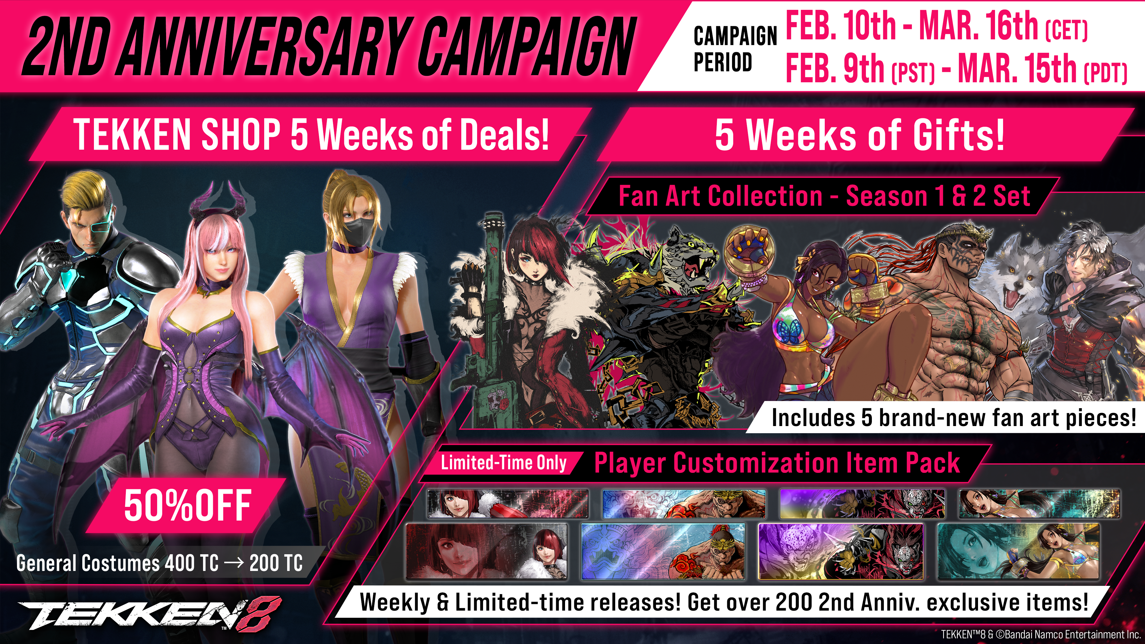 Four packs containing 2nd anniversary player customization items for all characters released up through Season 2 (excluding Clive). From Week 2 through Week 5 of the campaign (February 17th to March 16th), one pack will be distributed each week. Each pack can be obtained for free from the TEKKEN SHOP during its respective distribution period.