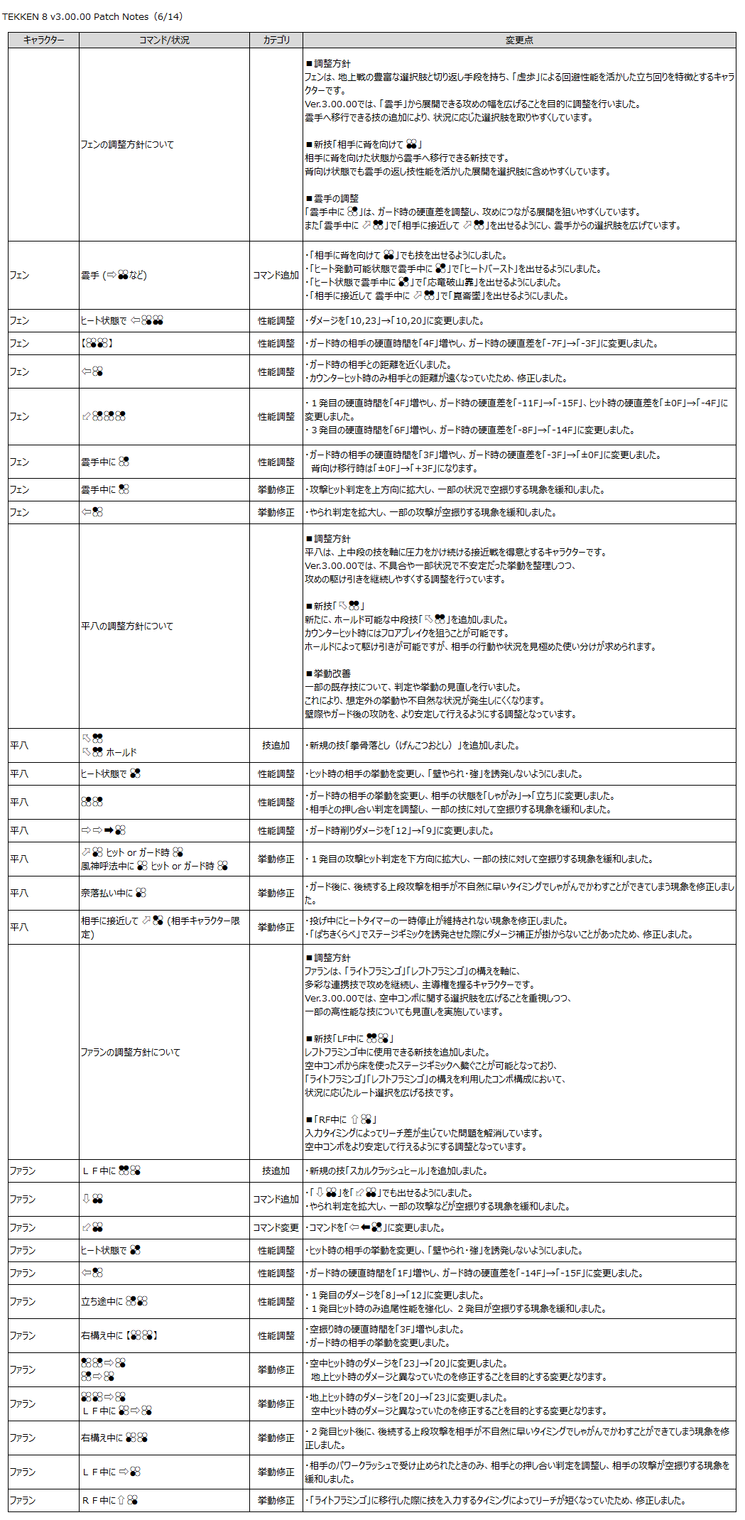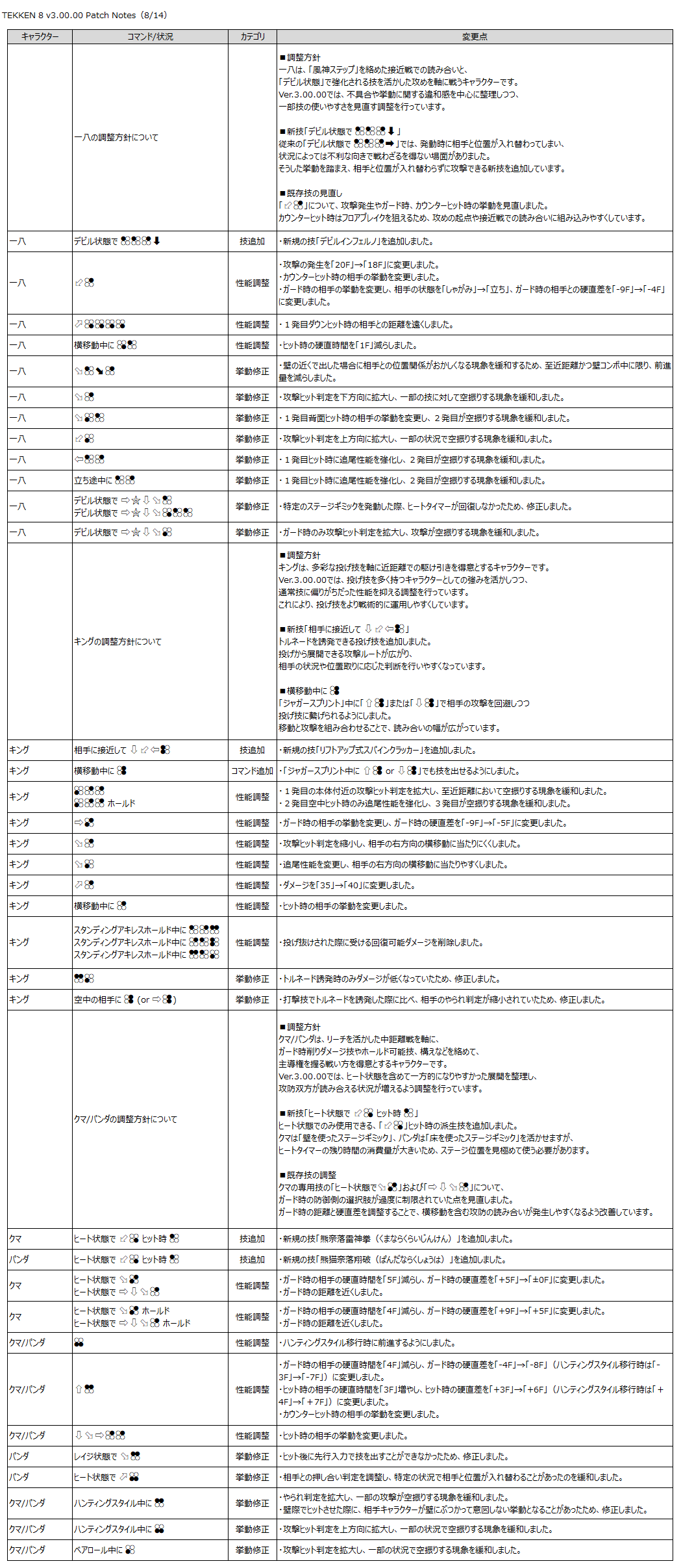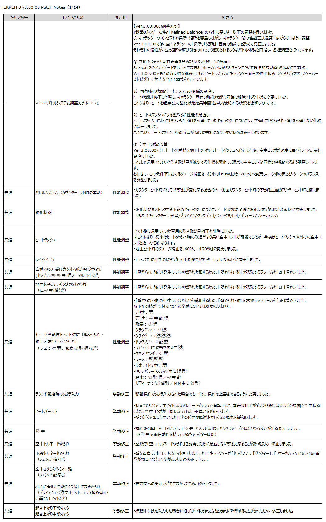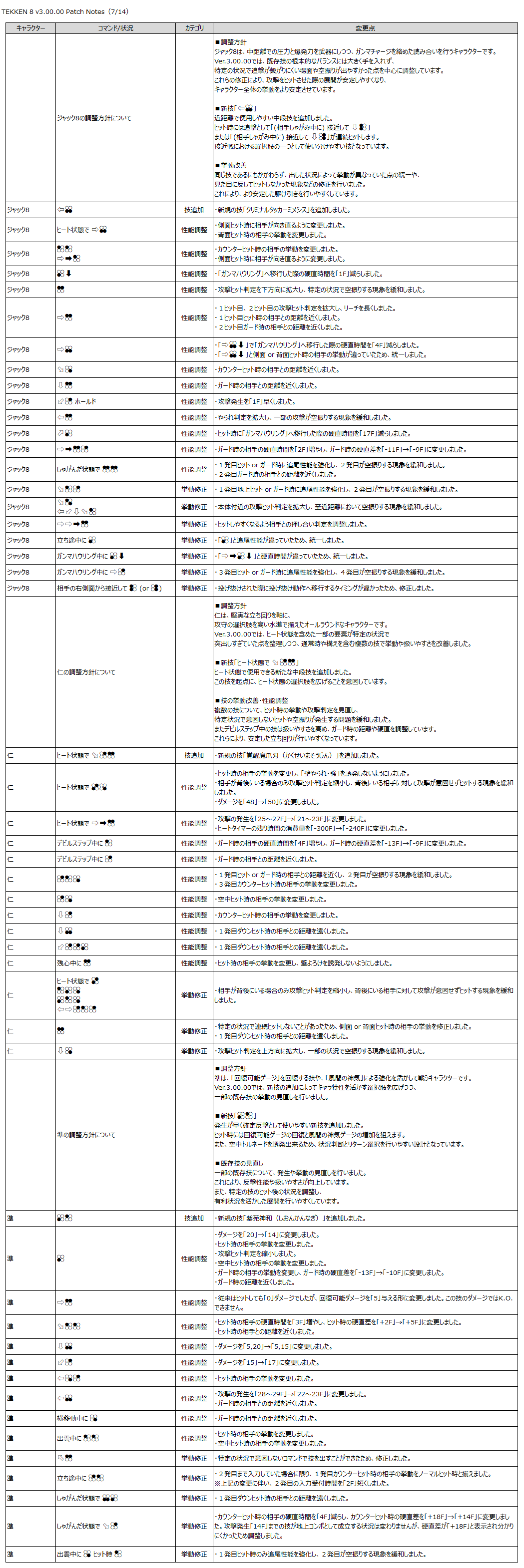 『鉄拳8』のゲーム性と「Refined Balance」の方針に基づき、以下の調整を行います。